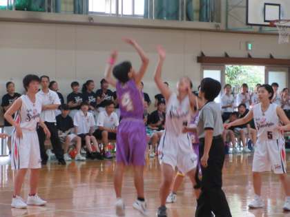 先取点は本校が取りましたが,地力に勝る修学院中学校に徐々に離され,16−76での敗戦となりました。苦しい局面で,練習に来ていた陸上部が大きな声援を送ってくれました。その応援に力をもらい,リバウンドも本校が優位にとれるようになり,動きも見違えるほどよくなりました。後半,善戦しましたが力及ばず,終了の笛を聞くこととなりました。
