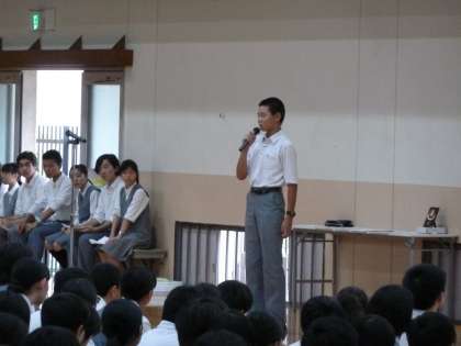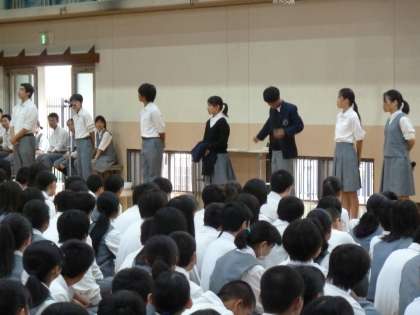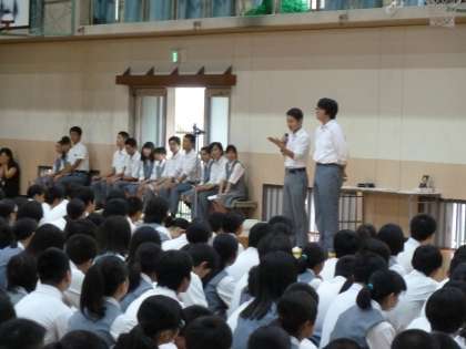 2学期始業式(1) 公開日 2019/08/23 更新日 2019/08/23 学校の様子 まずは生徒会から、生活委員会、藤中祭、生徒会改選、とお知らせが続きました。 学校行事が盛りだくさんの2学期が、いよいよ始まります。