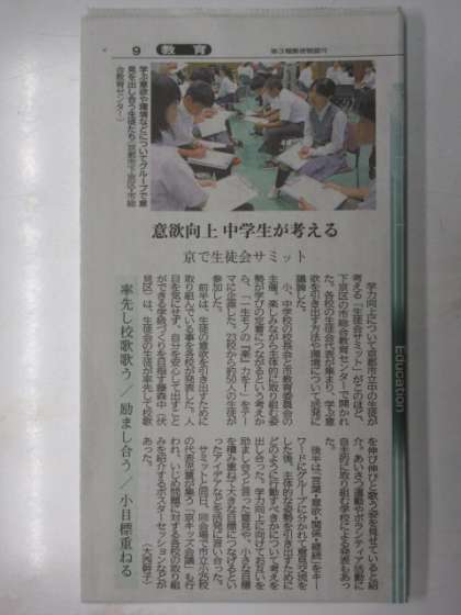 昨日8月31日(土)の京都新聞朝刊に,夏休みに行われた全市「生徒会サミット」の様子が掲載されていました。その中で,伏見支部代表で参加していた本校生徒会本部役員の発言(写真も掲載)が,記事として取り上げられていました。
