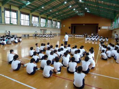 雨は上がりましたが、グラウンドが使えないのでこの時間も体育館で学年練習が行われています。
