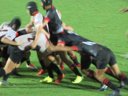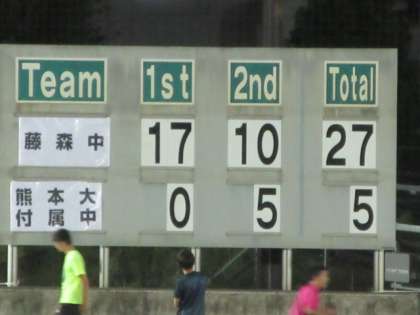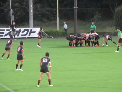 相手は,九州代表の熊本大学教育学部付属中学校です。開始早々にトライを決め,終始本校ラグビー部が優位にゲームを進め,スピードで圧倒しました。結果は27−5の快勝でした。