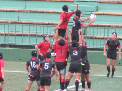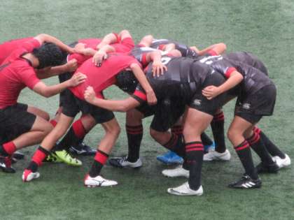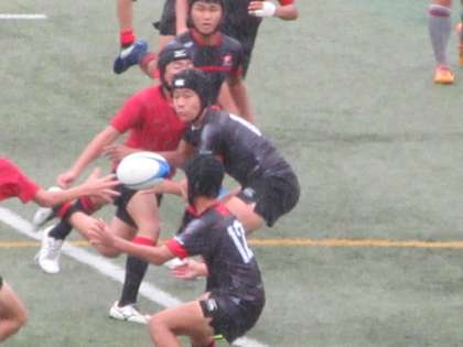 決勝戦は,10月27日(日)9:00キックオフです。会場は宝ヶ池球技場です。「One Team」の精神で闘い抜いてください。健闘を祈っています。(※黒のユニフォームが藤中ラグビー部です。)