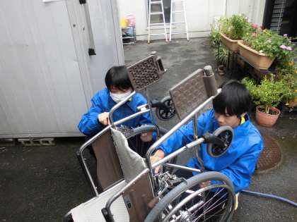 車いすの洗浄にも挑戦!歯ブラシで、細かいところまで洗いました。
