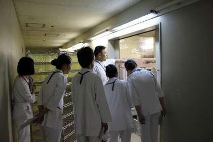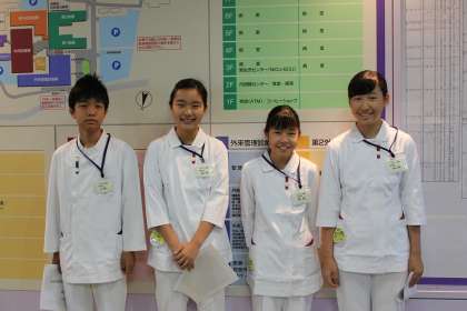 「初日はとても緊張していたけれど,笑顔も出てきました。」と事業所の方がおっしゃっていました。病院内を見学させて頂いているようで,このときは栄養士さんの仕事内容を聞き,給仕の仕組みについて学んでいました。