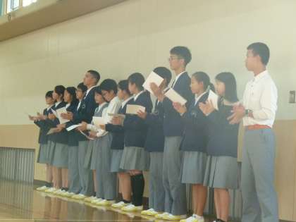 認証式2 公開日 2019/11/06 更新日 2019/11/06 学校の様子 第72期生徒会の認証に続き、各クラスの委員の認証が行われました。 後期は短いものの、学校の一年を締めくくる大事な5ヶ月です。 よろしくお願いします。 認証式に引き続き、全校生徒で全員写真を撮りました。