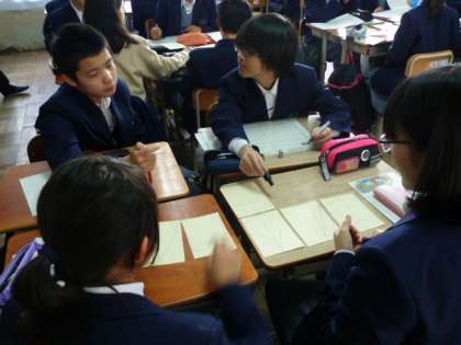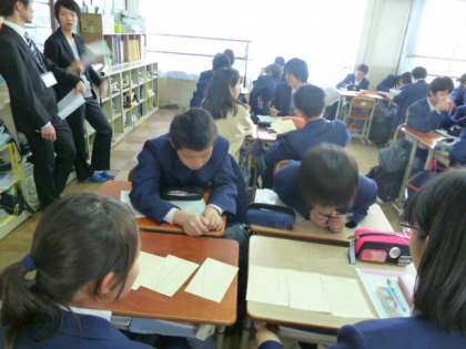 数学研究授業(1−8) 公開日 2019/11/29 更新日 2019/11/29 学校の様子 6時間目、1−8で研究授業が行われています。 今日は、ほかの学校の数学の先生を交えての研修です。 知らない先生方に見守られて緊張しているかと思いきや、 グループ内では和やかに意見交流がなされていました。 今月は2年生でも国語で同様の研究授業がある予定です。 力のつく授業を目指して、先生たちも頑張っています!