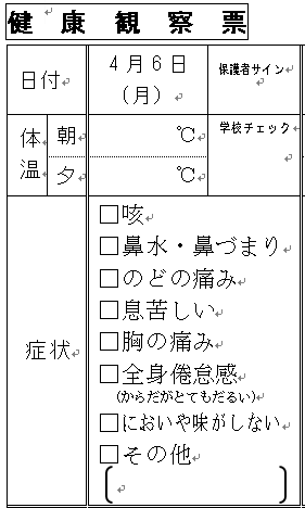 (写真は新学期に配布する新しい「健康観察票」と