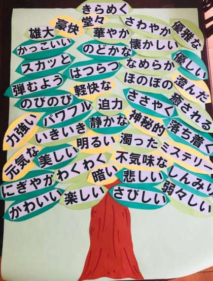 さて、どんな言葉を使って曲を表現しようかと悩んでいる人は【音楽の木】の音を表現する様々な言葉を参考にして、課題に取り組んでください!!素敵な作品を期待しています。