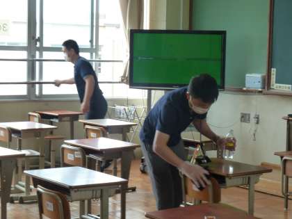 45分間の時間が終了した後は、学年の先生たちで教室や廊下の消毒を行います。