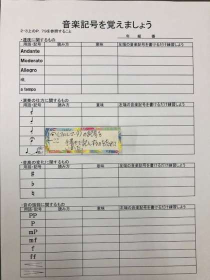 ・音楽記号のプリントで、写真にありますように、フェルマータの記号を手書きで書き足すのを忘れていたので書き加えておいてください。