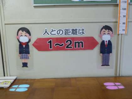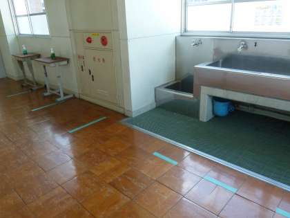 保健室の先生方によって、手洗い場にはアルボースが複数置かれ、ソーシャルディスタンスを示す掲示や立ち位置の印がつけられました。