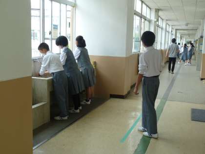 新しい生活の注意点について 公開日 2020/06/01 更新日 2020/06/01 学校の様子 集会の後は各担任の先生方から、これからの生活の注意点が詳しく説明されました。 衛生面を考慮して冷水機が撤去されたこと、手洗い場では間隔を取って並ぶこと、登下校時に南門が利用できること、当分は自分の登校時間をしっかり確認すること。 早速、少人数ずつ下校前の手洗いをはじめたクラスもありました。
