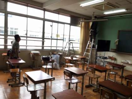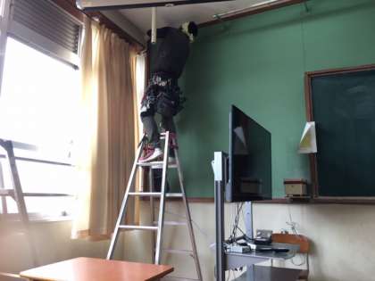 各教室では,電気屋さんがペアーで扇風機を設置して行きます。ただ扇風機を付けるだけではありません。天井裏に配線をし,扇風機に電気を送らなければ動きません。そして,スイッチにもつながなければなりません。扇風機1台付けるのには,たくさんの知識とその場所での臨機応変な対応力が必要です。そして,なんと言っても,ペアーのチームワークが1番必要です。