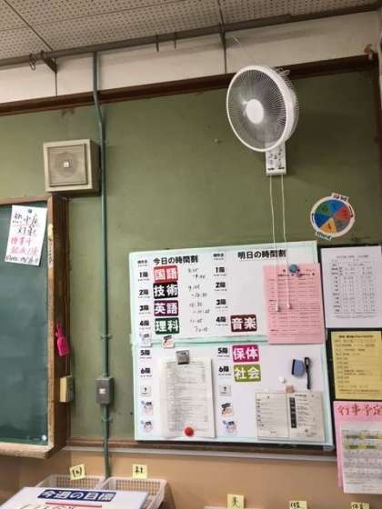教室に扇風機が付きました。来週からは暑くなりそうです。少しは涼しく授業ができると思います。電気屋さん,どうもありがとうございました。
