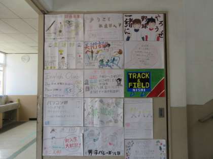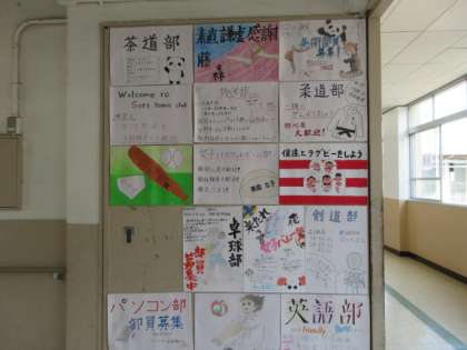上の写真は,1年生の2階廊下に張られた各部の紹介ポスターです。なかなかの力作ぞろいです。