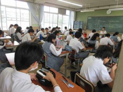 飛沫感染防止のため,全員が前を向き,会話も控えて食べていました。担任の先生も気を遣って,少しでも和やかな昼食の雰囲気になるようクイズを出しているクラスもありました。会話は控えめですが,当たり前の学校の風景が少しずつ戻ってきているようで,少しホッとしています。