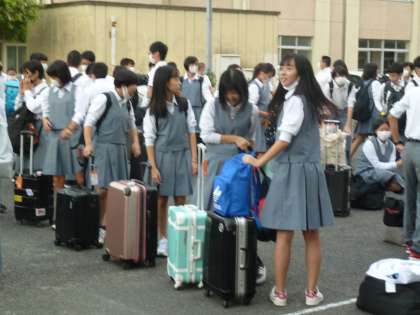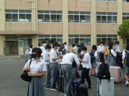 もうすぐ出発式!(3年生) 公開日 2020/09/09 更新日 2020/09/09 学校の様子 今日から長崎方面への修学旅行に出かける3年生。 7:25からの出発式に向けて、いま続々と集合し始めています。 今朝はいつもより少し涼しくて、絶好の旅日和となりそうですね。