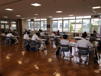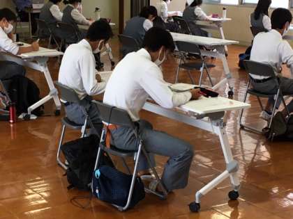 3年生の学習会の様子です。感染症対策も考えながら,広く気持ちのよいフロアーで学習をしています。本日は,野球とラグビーの代替大会があり,参加できない生徒もいますが,それぞれの場面で一生懸命に自分の力を発揮してくれています。