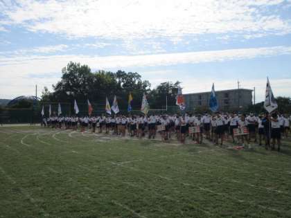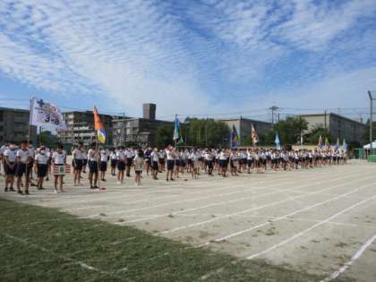 開会式の様子です。 青空の下、各クラスの学級旗が鮮やかです。