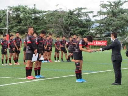 前半,思うような展開に持ち込めず,0−5で折り返しました。後半も相手に先にトライ・ゴールを許し,チャンスはあったのですが1トライを返すにとどまりました。後半は,5−7で,トータル5−12の惜敗でした。結果は残念でしたが,3年生が本校ラグビー部の伝統をしっかりと引き継ぎ,後輩たちに伝えてくれました。3年生の皆さん,3年間の厳しい練習によく耐え,頑張ってきました。これを自信と誇りに変えてください。保護者の皆様,いつも魂のこもったご声援に,深く感謝いたします。ありがとうございました。