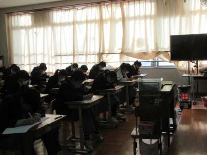 さて,各学年とも集中してテスト問題に取り組んでいます。スートブが各教室で使用されていますが,新型コロナ感染防止のために,対角に2ヶ所窓・扉を開けてテストを行っています。感染には予断をまだまだ許さない状況が続いていますので,しっかりと対策を講じながら,テスト勉強に頑張ってください。健闘を祈っています!