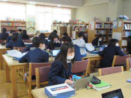 市教委から配分されましたGIGA端末を使って,3年生が図書館で国語の授業を行っていました。学習活動は,Teamsを使って,公立高校の入試対策問題を解いていました。3月8日(月)には,公立高校中期入試が行われます。進路決定に向けて,大詰めを迎えていきます。ガンバレ3年生!