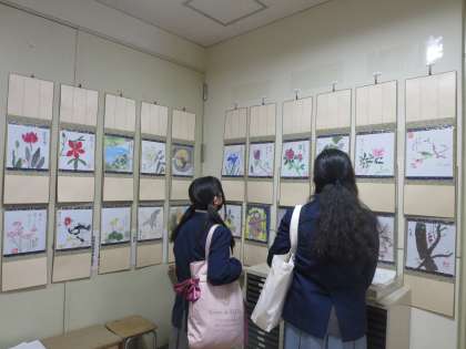 展示作品は,卒業を前にして制作した,日本画の技法を使っての卒業作品です。濃淡の墨を用いて,墨の振る舞いを学んだ後,教科書の「鳥獣人物戯画」の好きな場面を墨で模写したり,美術大学の学生が学ぶ手本を試しに模写したりした後に,様々な手本から選択した絵を,自分のアレンジを加えながら,日本画の画材「水干絵の具」を用いて,初めての日本画にチャレンジしました。制作の間は,静まり返って落ち着いた時間が流れ,緊張感を持って取り組む姿がありました。絵の具に慣れてきたころには,一筆一筆を楽しみながらじっくり描きすすめ,どのクラスからも素敵な色紙絵が生まれました。