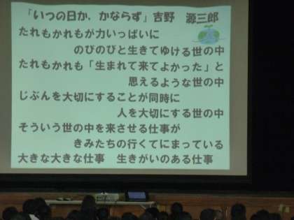 校長先生より。 紹介された小学生の作文のエピソードや吉野源三郎の詩に,静かに耳を傾けていました。