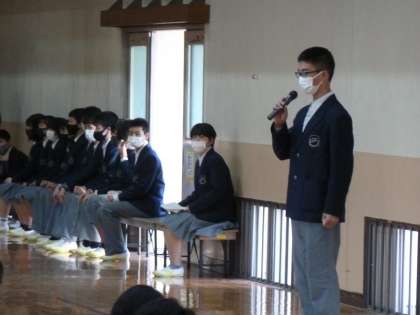 令和2年度 修了式3 公開日 2021/03/19 更新日 2021/03/19 学校の様子 いつか3学年全員で集まる日が来ても,今日のような聞く姿勢を藤中の伝統として継承していきたいですね。 いよいよ新2年生,新3年生となる皆さんの肩にかかっていますよ。 生徒会本部のみなさん,今日はありがとう。 急な変更でしたが,上手に進めてくれました。 これから,新年度に向けて大掃除。 その後,11:15を目途に学級の締めくくりです。
