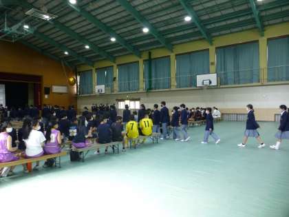 本日1・2限目に新入生歓迎会が行われました。1年生と代表生徒(本部役員や評議員,部活動代表生徒など)は体育館で,それ以外の2・3年生はそれぞれの教室で中継して行われました。