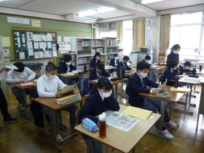 本日2限目,11組の授業風景です。 担任の先生と一緒に新聞記事を読んで,みんなで意見を交流しました!