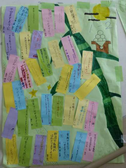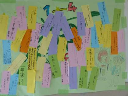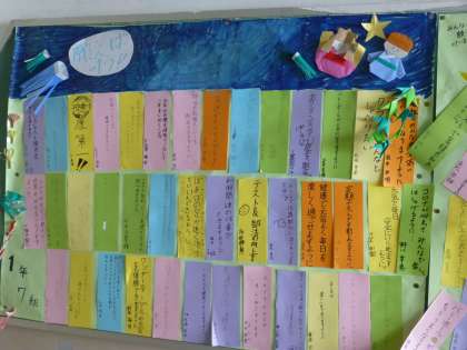 今日は7月7日です。あいにくの雨になってしまいましたが,1年生のフロアには,クラス毎に,大きな模造紙に七夕飾りの絵を描き,その上にみんなの願いが書かれた短冊が飾られています。