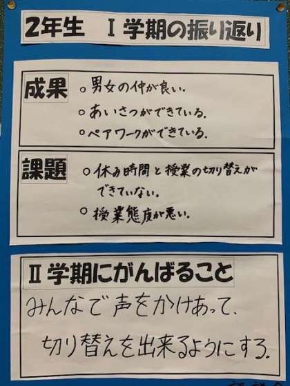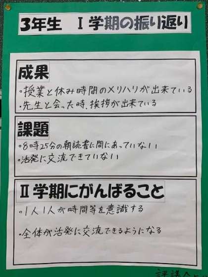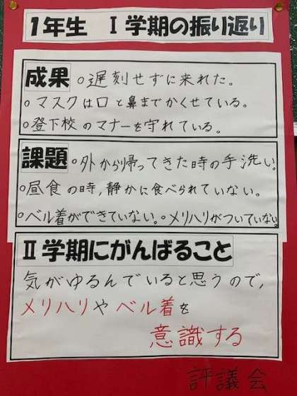 各学年の成果と課題 公開日 2021/07/14 更新日 2021/07/14 学校の様子 1学期もあと少しで終わりを迎えます。 各学年で1学期間を振り返り,成果と課題について 評議員がまとめてくれました。
