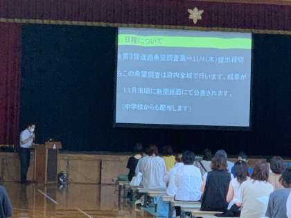 10/11(月)に3年生保護者対象の進路説明会を開催いたしました。お忙しい中,多数の保護者様にご来校いただき,誠にありがとうございました。3年生につきましては,お子様を通じて全員に当日配布の資料をお届けいたします。1年生および2年生の保護者様については,このホームページの配布文書(学校よりの欄)から資料が閲覧できますので,ぜひご覧下さい。
