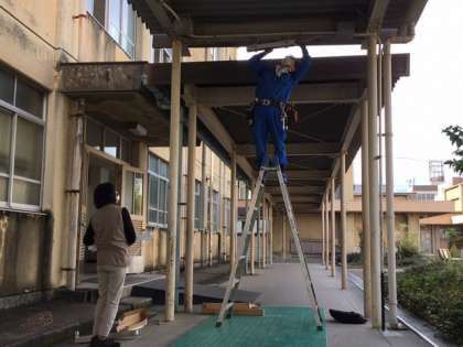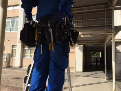 昨日のチャレンジ訪問で,電気関係の事業所の方が本校で生徒の取材を受けてくださいました。その事業所の方が,本校渡り廊下の電灯を交換しに来られました。「電灯交換しながらインタビュー受けたら良かったかなぁ…その方が,わかりやすかったかなぁ…」と”生徒思い”の言葉をいただきました。腰にはプロの道具がズラリとぶら下がっていました。さすがプロ!あっという間に交換され,帰って行かれました。