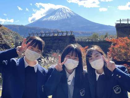 「いやしの里根場・に着きました。天気も良く,茅引き屋根や富士山,紅葉もきれいです。それぞれに写真を撮り,日本の原風景の中でのんびりと時間をすごしています。