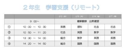 明日2月2日(水)よりリモート学習を再度行います。時間割を確認して,会議に参加してください。