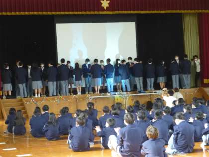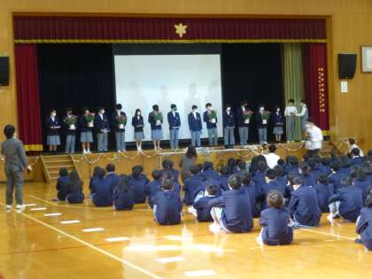開会のあいさつのあとは,映像による藤中紹介です。校歌の紹介や藤中の一日の様子を楽しく説明してくれました。緊張していた1年生も,徐々にリラックスした雰囲気に!そしてプレゼントの贈呈です!入学,おめでとうございます!