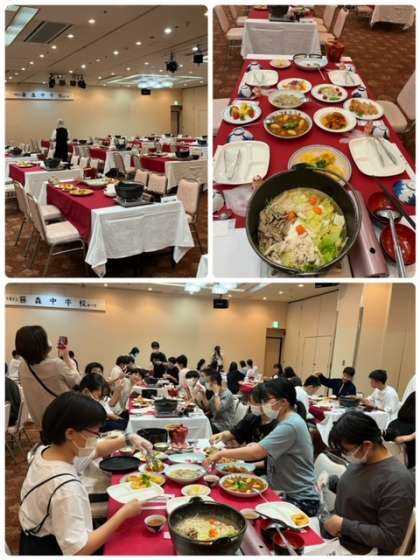 修学旅行1日目 〜夕食の様子〜 公開日 2022/05/27 更新日 2022/05/27 3年生 食事は二つの会場に分かれて食べます。おやつも沢山食べたのに,みんな食欲モリモリです。中華メニューが中心です。