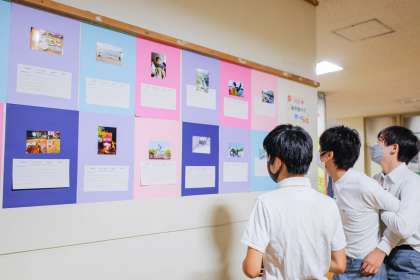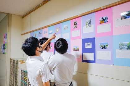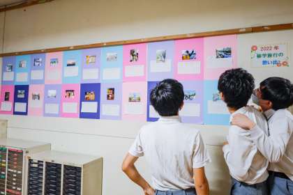 3年生 修学旅行の想い出 公開日 2022/07/06 更新日 2022/07/06 3年生 修学旅行から早くも一ヵ月が経ちましたね。 階段の壁には,3年生の生徒たちが〈2022年 修学旅行の想い出〉として,カタチに残した作品が張り出されました。 写真は写真部門の作品です。