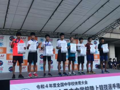 8月18日(木)〜21(日)の日程で,第49回全日本中学校陸上競技選手権大会が福島・とうほう・みんなのスタジアムで行われ,本校3年生のO君が,3000mに出場しました。昨日の予選に引き続き,本日の決勝にコマを進めました。予選と同様に,決勝でも素晴らしい走りを見せてくれました。結果は,8分21秒05の大会新記録で,堂々の3位入賞を果たしました。5位までの入賞者が大会記録を更新するハイペースの中,しっかりと自分の走りをした結果ですね。そしてこの記録は,京都中学新記録。本当に,おめでとうございます。