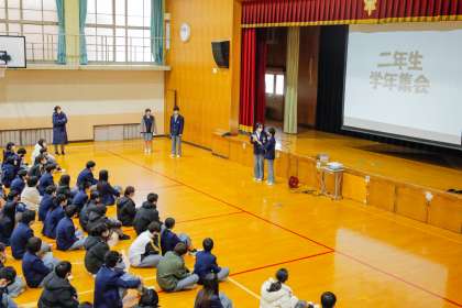 2年生 学年集会1 公開日 2022/12/23 更新日 2022/12/23 2年生 本日4時間目に学年集会が行われました。 まずは,1組から順番に,各クラスの評議委員さんが2学期の振り返りを発表してくれました。