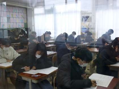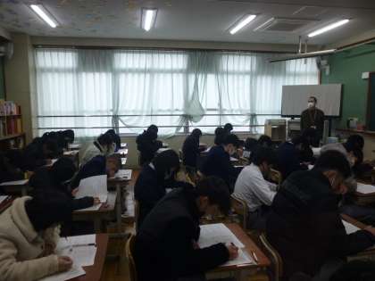 写真は1限目英語テストで、聞き取りの問題に取り組んでいる様子です。