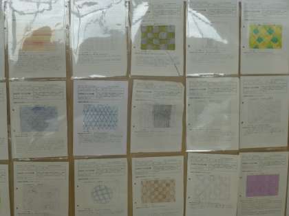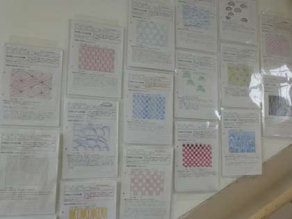 1年生の廊下には、美術科の作品(生活をいろどる文様)が掲示されています。生活の中にある伝統的な文様の歴史や由来を調べた作品で、とても興味深い作品になっています!