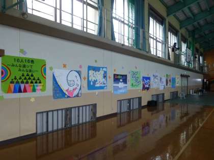 体育館の壁には、各クラスの学級旗やきれいな装飾が見られました!