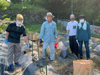 晴天の中、民泊先でそれぞれの活動が始まりました! ナスの植付けやお米栽培の作業しています!