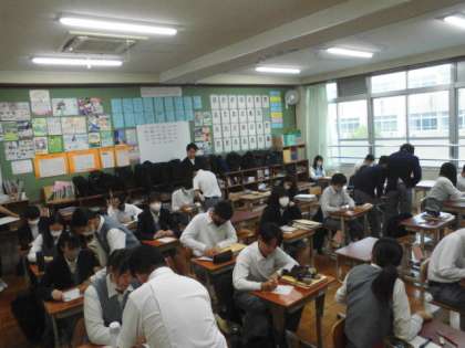 教員の研修授業 公開日 2023/05/19 更新日 2023/05/19 学校の様子 本校では「自ら学ぶ力を生徒に育む」をテーマに、先生方が本気で取り組んでいます。今年度は定期的にお互いの授業を見合って、良い授業方法を研鑽し合う取組みが始まりました。 本日は1限に3−6で国語科、2限に3−1で数学科、5限に1−6で理科、6限に体育館で保健体育科が教科の先生による授業の参観を行い、研修を進めました。