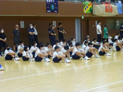 本日、島津アリーナ京都で、京都市中学校合同球技大会が開催され、本校は午後の部に参加をしました。通常通りに登校したあと、諸注意を受け、地下鉄・市バスに乗って会場へ向かいました。