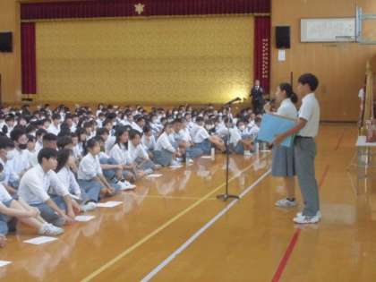 始業式で生徒会から、服のリサイクルプロジェクトの開始について、連絡を行いました。