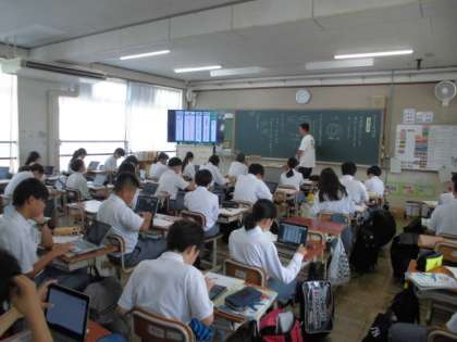 タブレットなどのICTを教師も生徒も有効に活用しながら、方言と共通語について学ぶ、とても興味深い授業でした。お互いの授業を見合うことで、自分の授業もふり返り、改善に繋がっていきます。